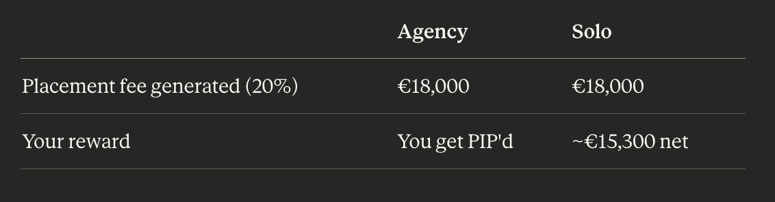 An agency provides structure, community, a higher floor but a lower ceiling. For early-career recruiters, it is an invaluable starting point. But when you reach the stage where you are winning your own clients and managing your own pipeline end-to-end, your agency quickly turns into the world's most expensive administrative assistant.