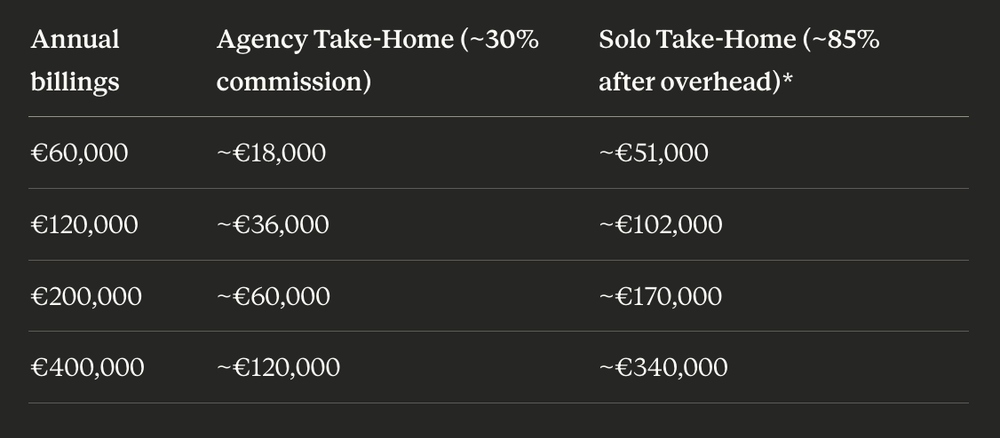 At an average agency, if you bill €200k in a year, you might take home €60k (before tax) if the commissions are generous. If you bill €200k working for yourself, you are keeping at least €170k. You are nearly tripling your income for the same amount of work. If you just want to maintain your income at €60k we are talking about needing to make 3, maybe 4 placements in a year. Easy right?